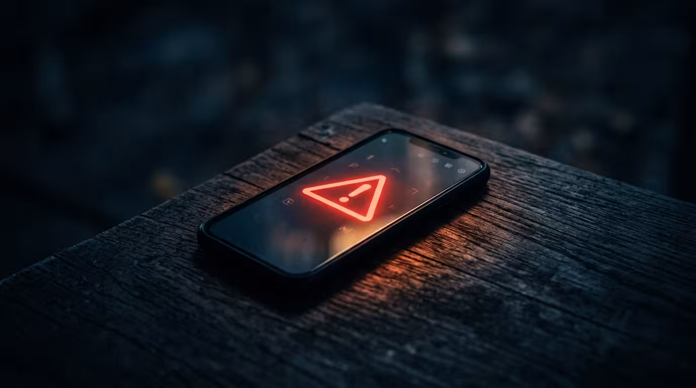 Smartphone displaying a warning triangle — sugar daddy scam red flag alert